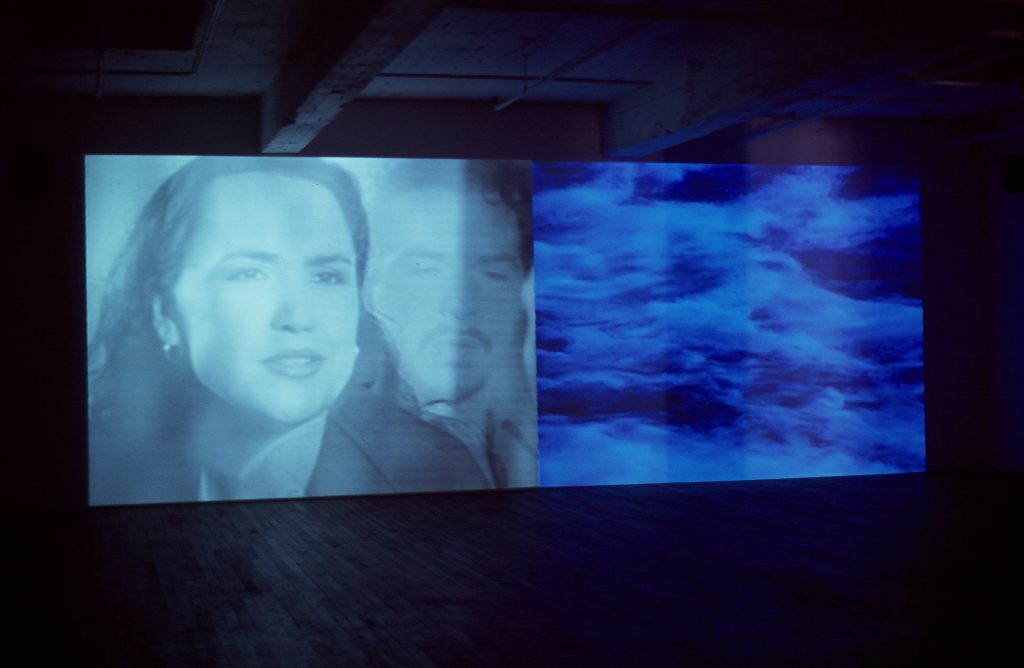 “Waterspeak, a new installation work, blends video and film footage of waterfalls and the winter rapids of Capilano River to address issues of environmental degradation and differing cultural constructions of nature. Merging with the water, the characters Man and Woman overlap and dissolve in a quiet, insistent discussion about listening and speaking. The multiple moving images of natural phenomena are heightened through their scale and saturated colour. A rich and complex audio track samples water sounds and throat-singing with music by Russell Wallace, a composer who has collaborated with Claxton over the past decade. The seductive qualities of recorded voice, the familiarity of video and film, and the contemplative space of the gallery combine in an investigation of the sacred in art and the place these concerns might be given within the ‘artspeak’ of visual arts practice.” (Lorna Brown)